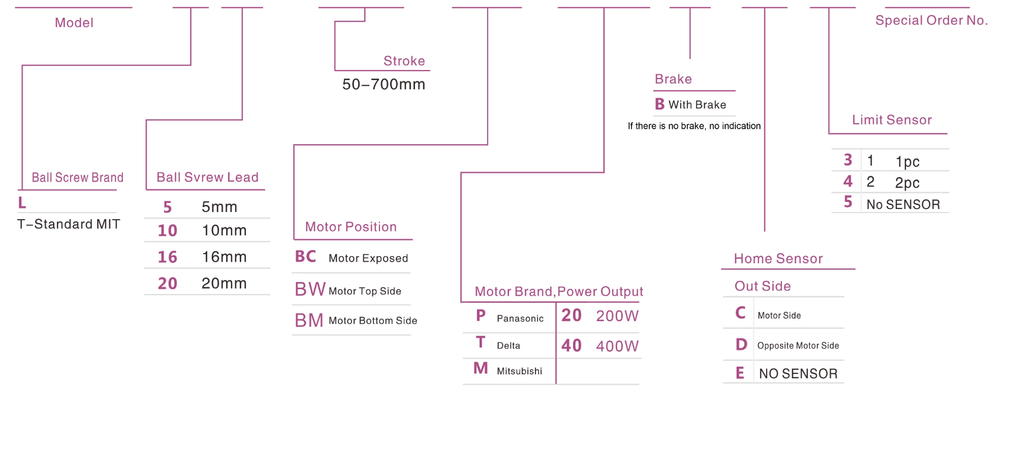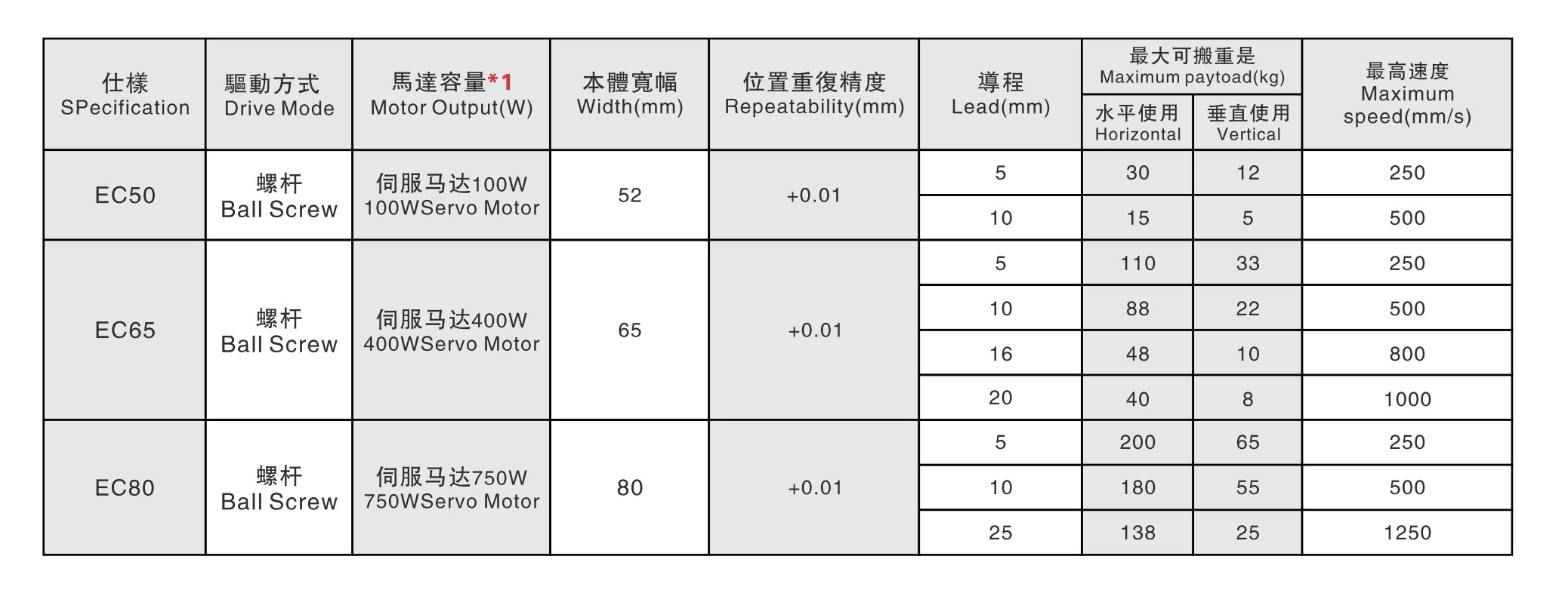 | Usa dove | Modalità guidata | Specifiche del modello | Potenza motore (w) | Larghezza (mm) | Ripetibilità (mm) | Specifiche della vite a sfere | Carico utile massimo (kg) | Velocità massima (mm/s) *1 | ||