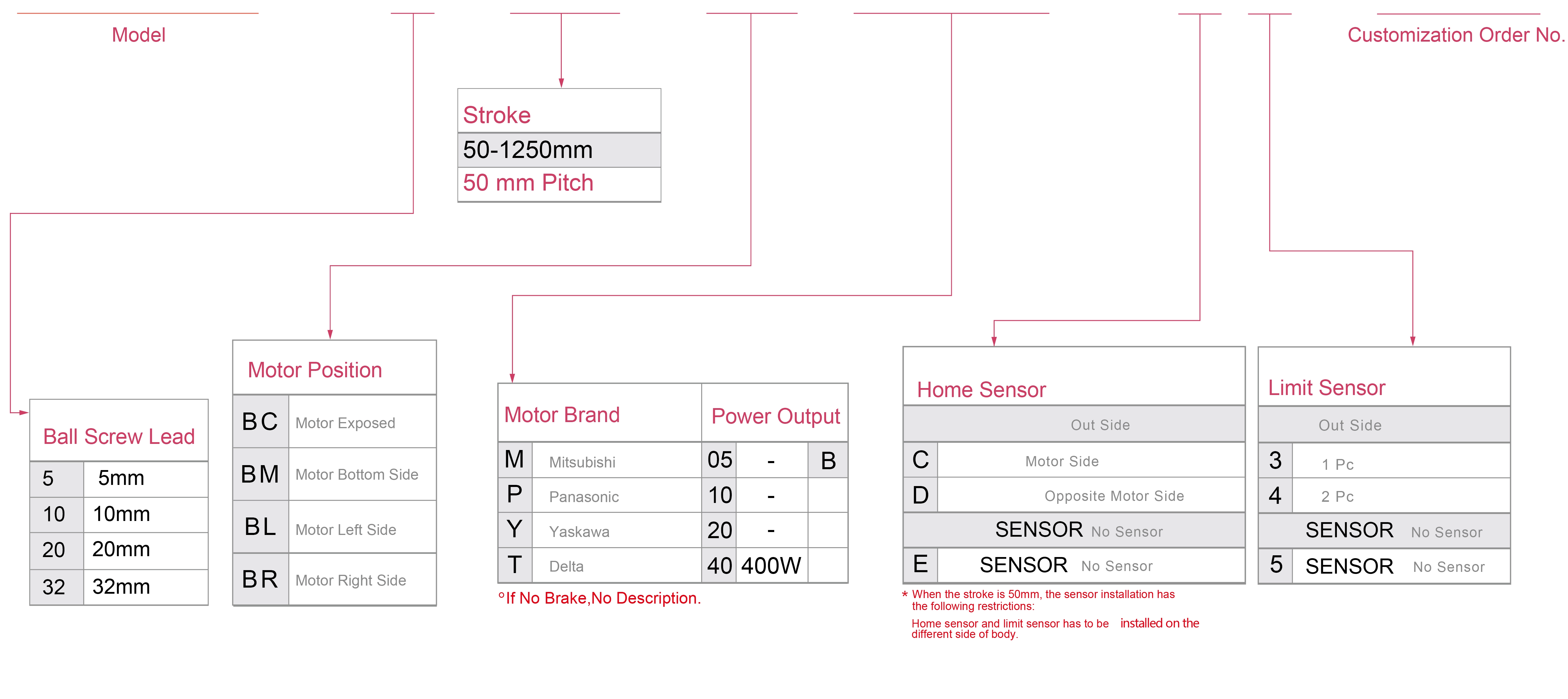 | Usa dove | Modalità guidata | Specifiche del modello | Potenza del motore (la) | Larghezza (mm) | Ripetibilità (mm) | Specifiche della vite a sfere | Carico utile massimo (kg) | Velocità massima (mm/s) *1 | ||