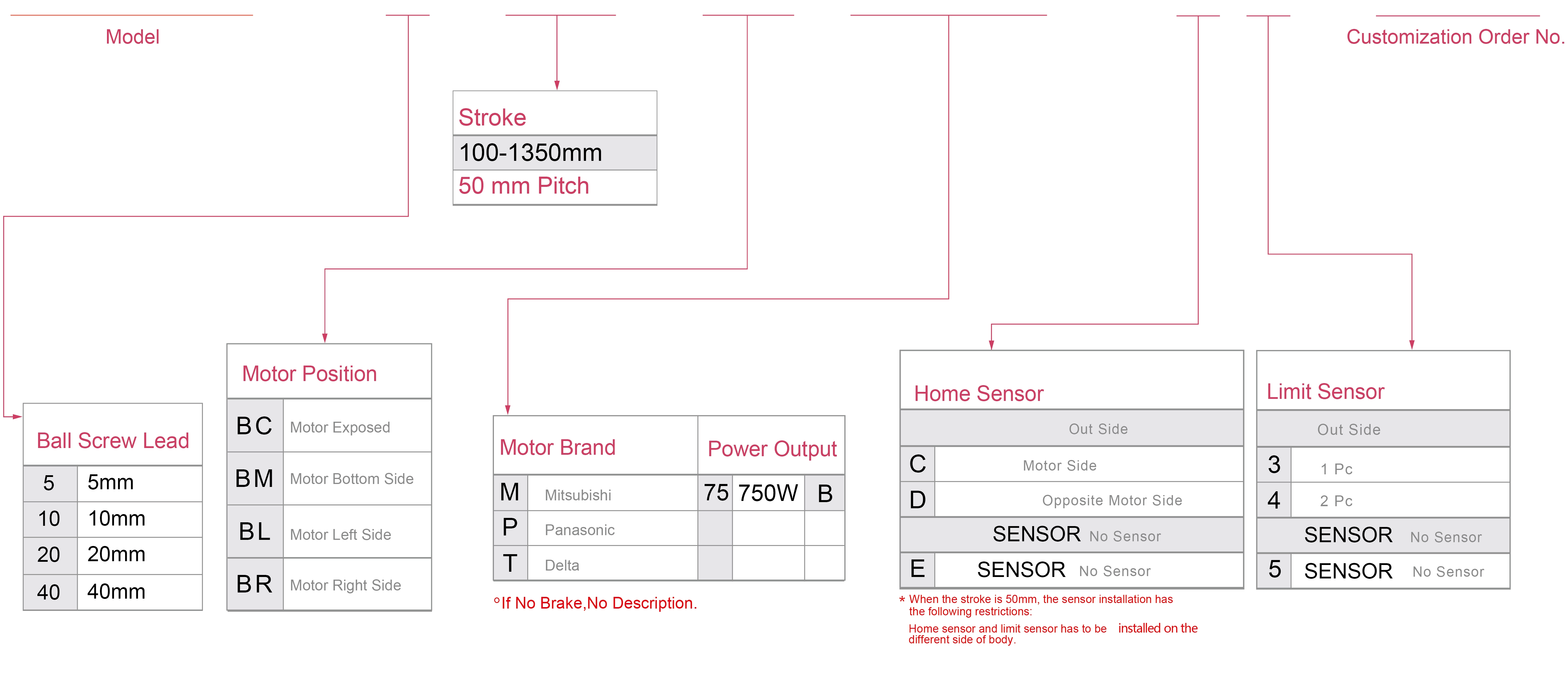 | Usa dove | Modalità guidata | Specifiche del modello | Potenza del motore (la) | Larghezza (mm) | Ripetibilità (mm) | Specifiche della vite a sfere | Carico utile massimo (kg) | Velocità massima (mm/s) *1 | ||