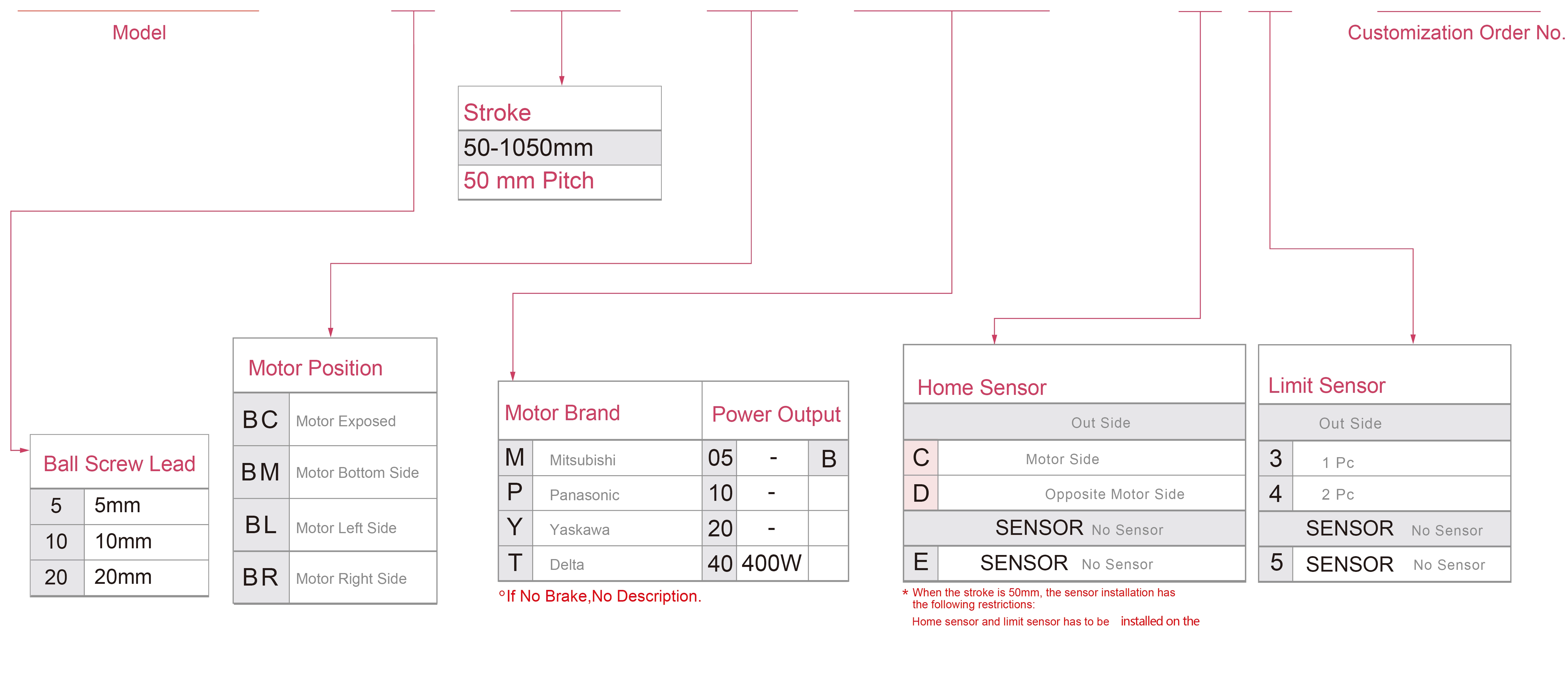 | Usa dove | Modalità guidata | Specifiche del modello | Potenza del motore (la) | Larghezza (mm) | Ripetibilità (mm) | Specifiche della vite a sfere | Carico utile massimo (kg) | Velocità massima (mm/s) *1 | ||