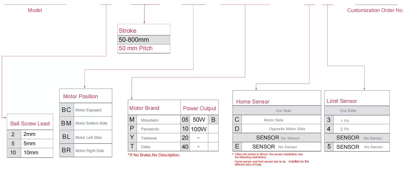 | Usa dove | Modalità guidata | Specifiche del modello | Potenza del motore (la) | Larghezza (mm) | Ripetibilità (mm) | Specifiche della vite a sfere | Carico utile massimo (kg) | Velocità massima (mm/s) *1 | ||