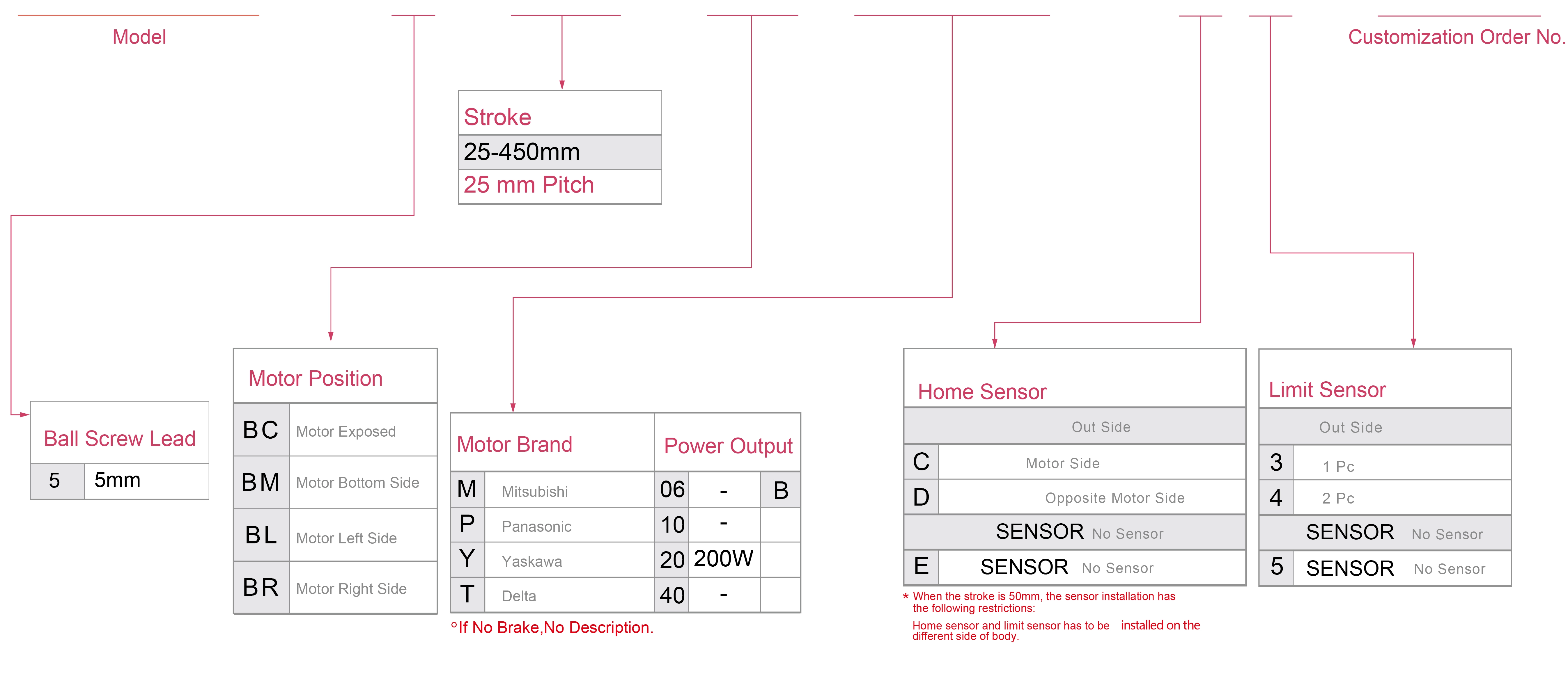 | Usa dove | Modalità guidata | Specifiche del modello | Potenza del motore (la) | Larghezza (mm) | Ripetibilità (mm) | Specifiche della vite a sfere | Carico utile massimo (kg) | Velocità massima (mm/s) *1 | ||