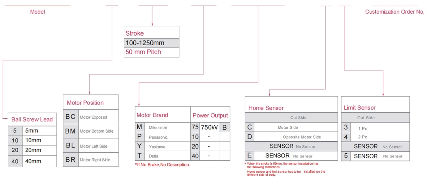 | Usa dove | Modalità guidata | Specifiche del modello | Potenza del motore (la) | Larghezza (mm) | Altezza del corpo (mm) | Ripetibilità (mm) | Specifiche della vite a sfere | Carico utile massimo (kg) | Velocità massima (mm/s) *1 | ||||||||||