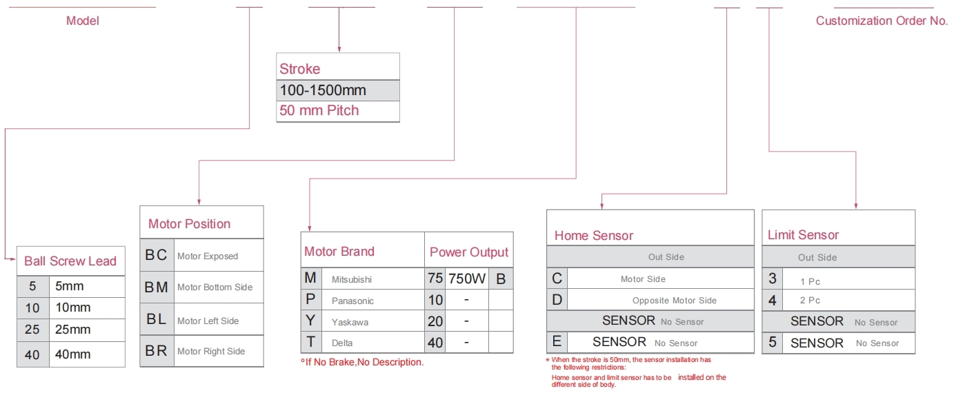 | Usa dove | Modalità guidata | Specifiche del modello | Potenza del motore (la) | Larghezza (mm) | Altezza del corpo (mm) | Ripetibilità (mm) | Specifiche della vite a sfere | Carico utile massimo (kg) | Velocità massima (mm/s) *1 | ||||||||||