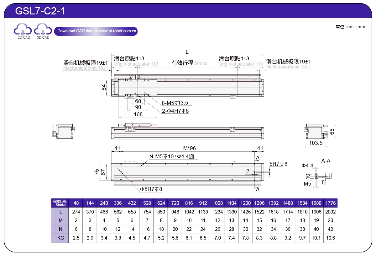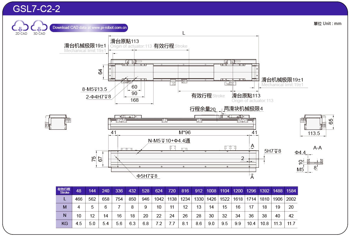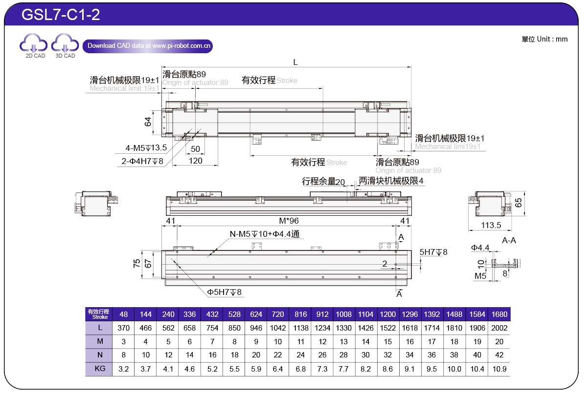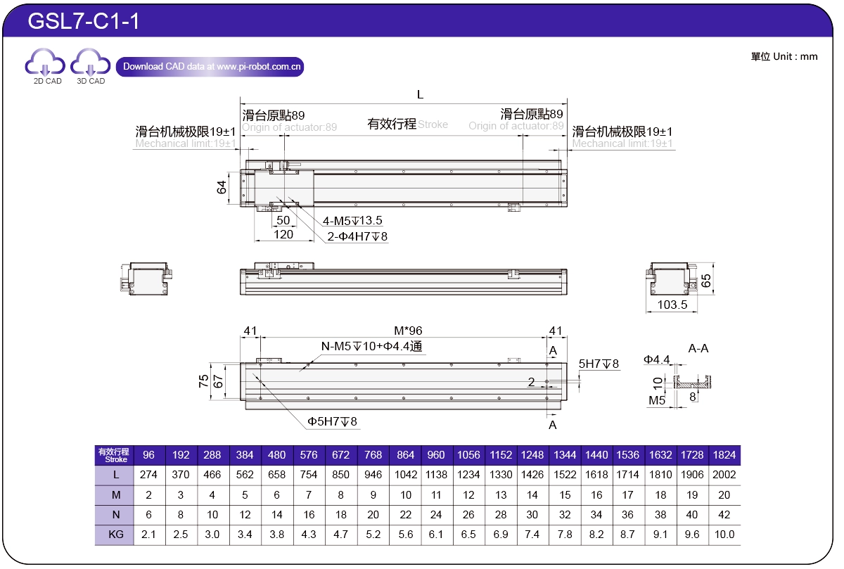 | Standard | Robot con motore lineare | GSL7 | P27-C1 | 75 | 65 | ±0,003 | 26 | 57 | 3.3 | 6 | 2500 |