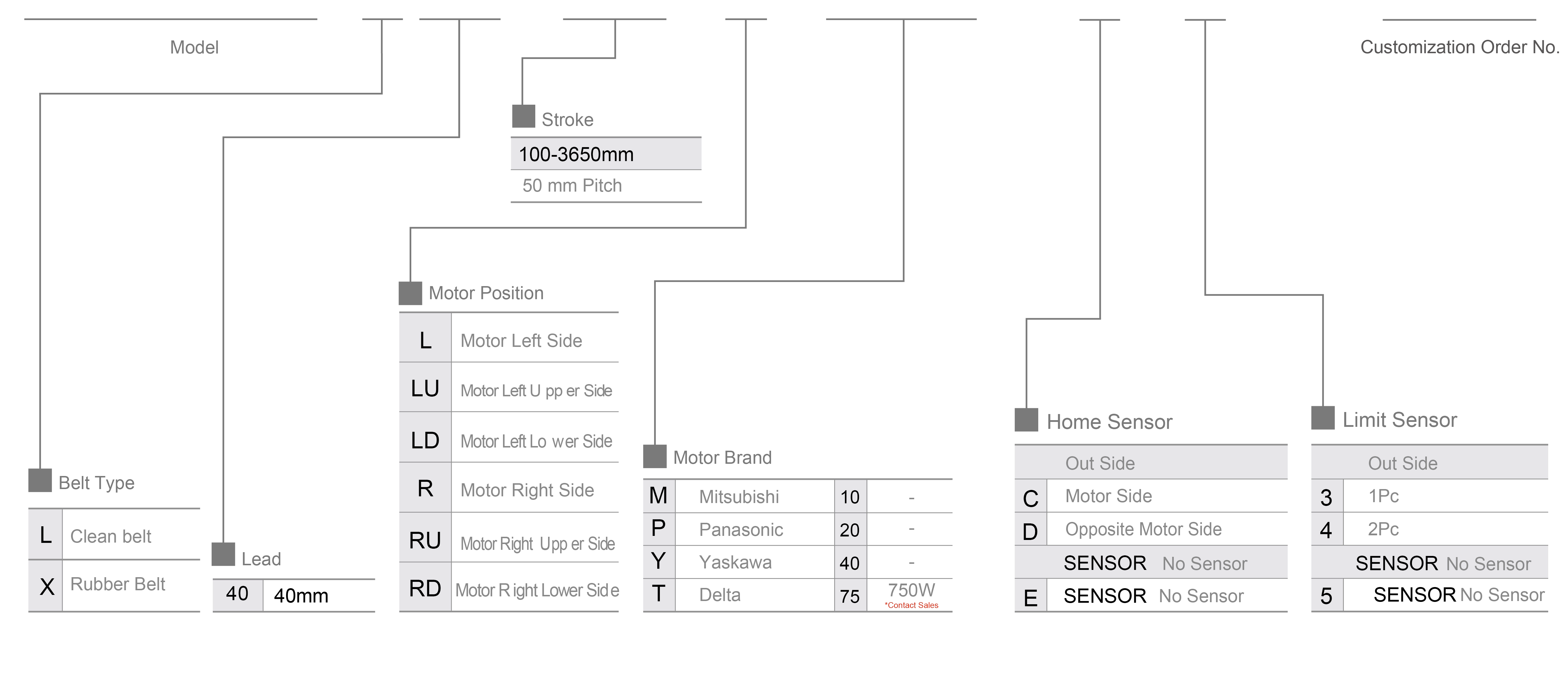 | Usa dove | Modalità guidata | Specifiche del modello | Meccanismo di riduzione | Potenza del motore (la) | Larghezza (mm) | Altezza del corpo (mm) | Ripetibilità (mm) | Specifiche della cinghia | Carico utile massimo (kg) | Velocità massima (mm/s) *1 | ||