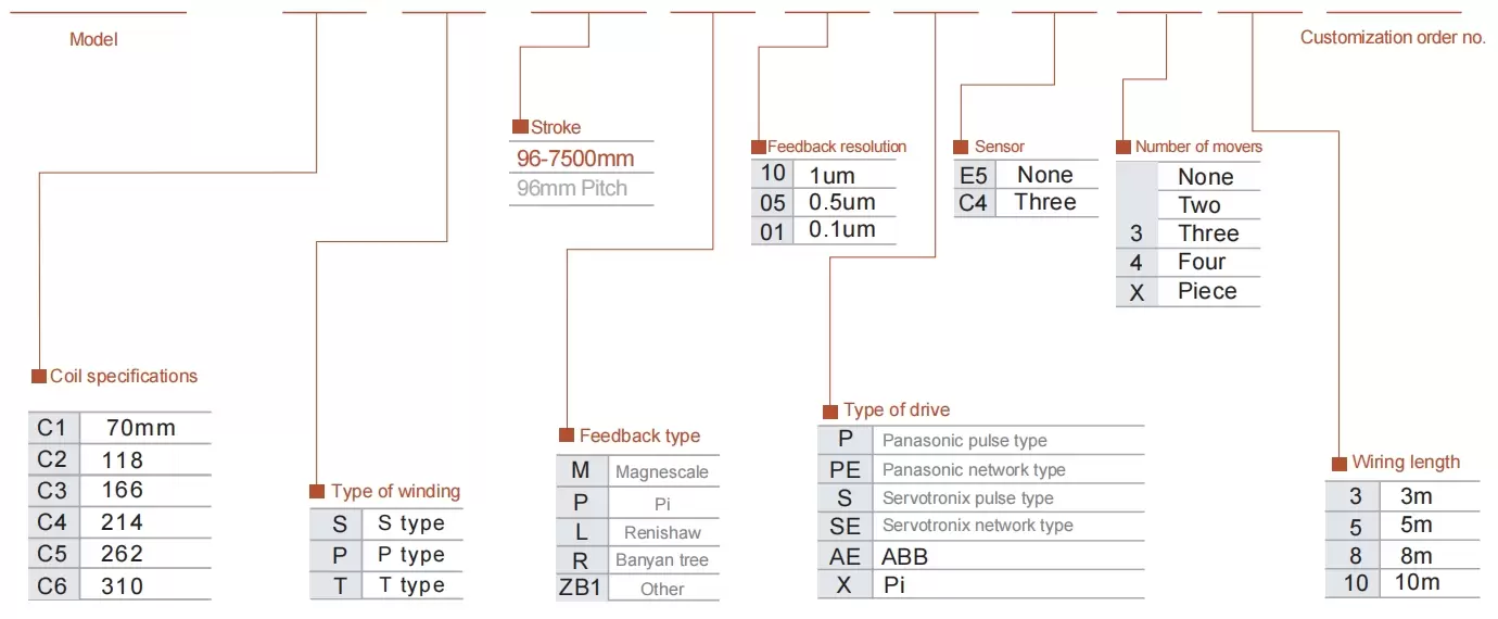 | Usa dove | Modalità guidata | Specifiche del modello | Specifiche del motore | La larghezza del corpo (mm) | L'altezza del corpo (mm) | Ripetibilità (mm) | Spinta continua (N) | Spinta massima (N) | lrms(A) | Carico utile massimo (kg) | Velocità massima (mm/s) *1 |