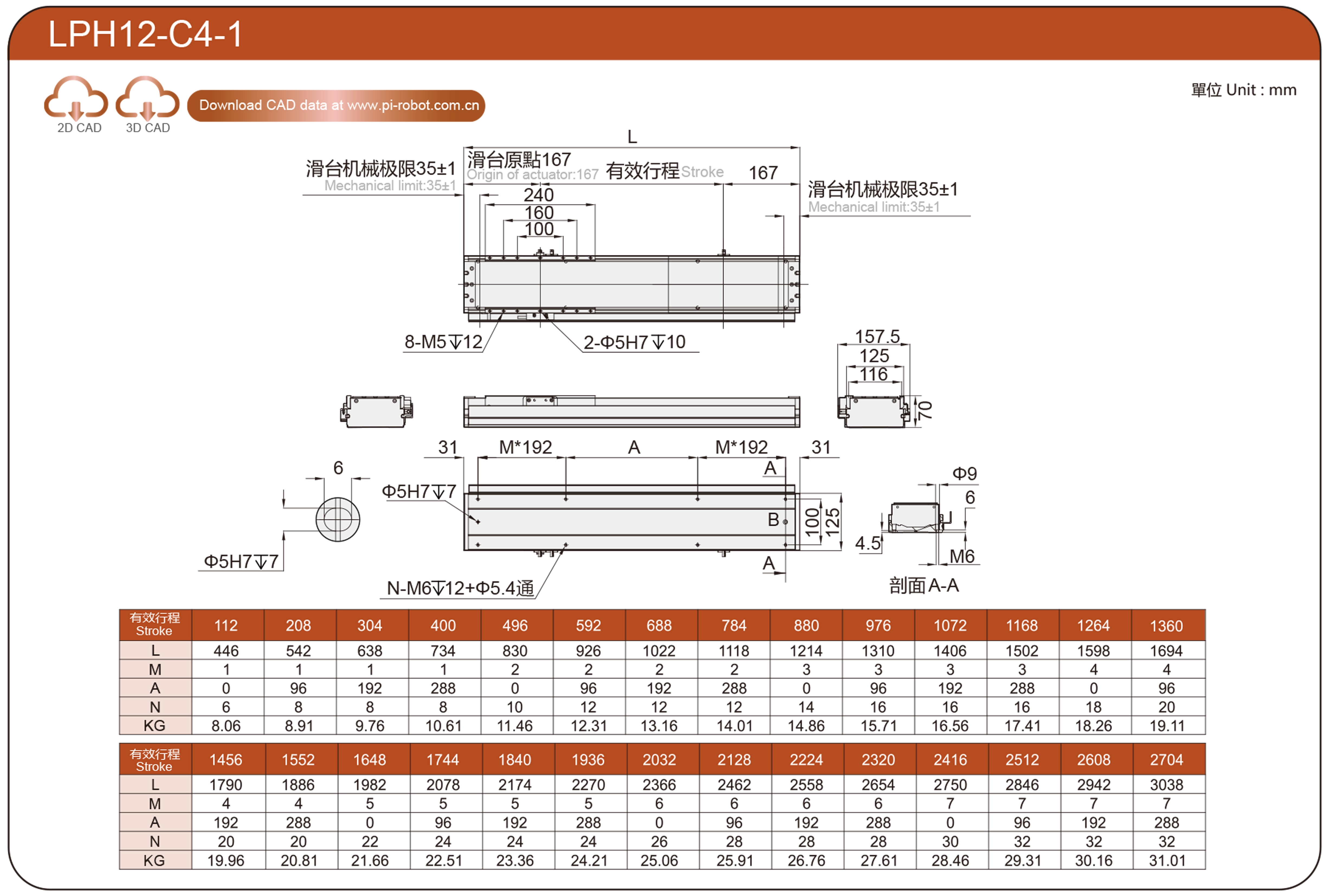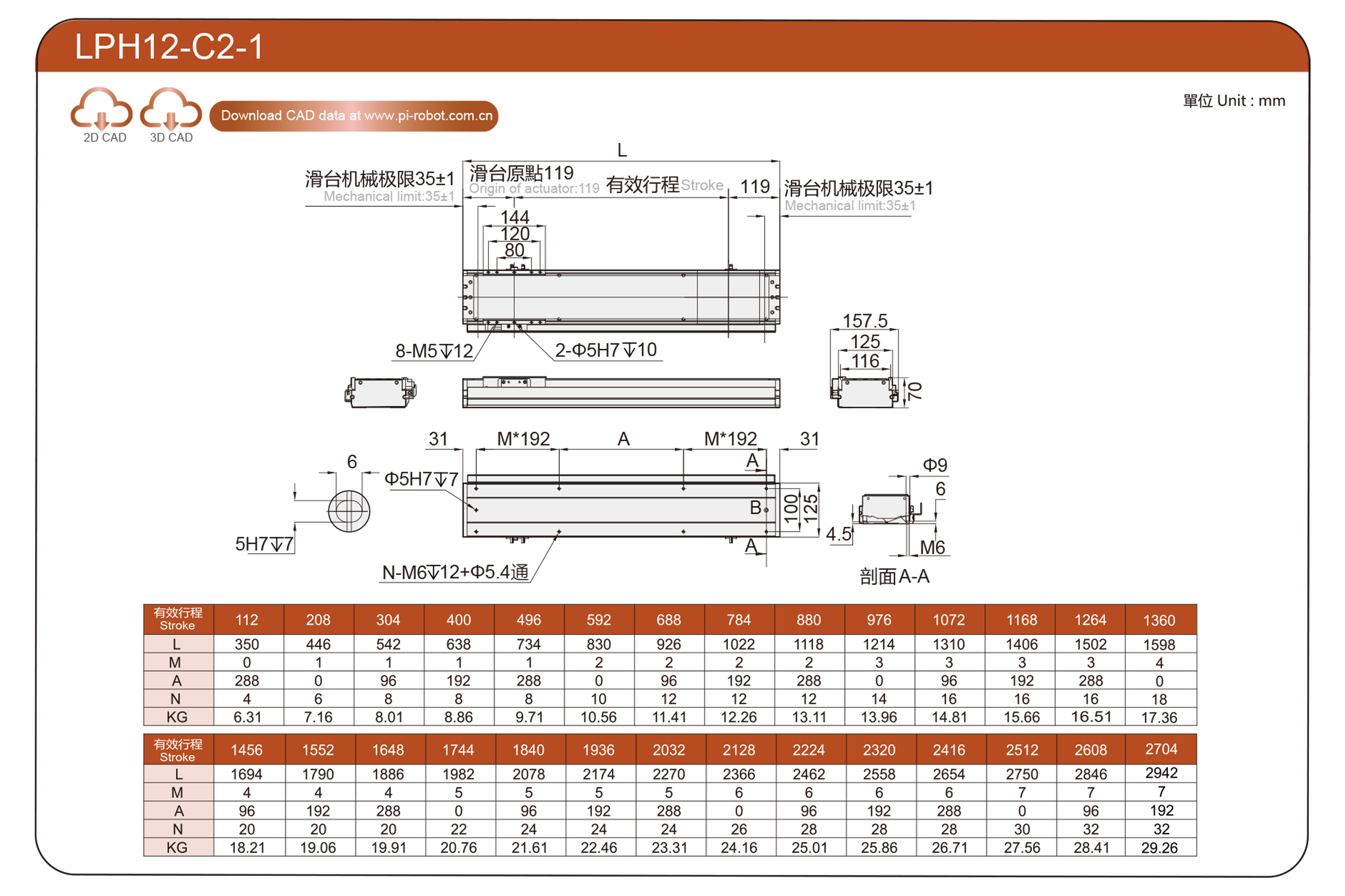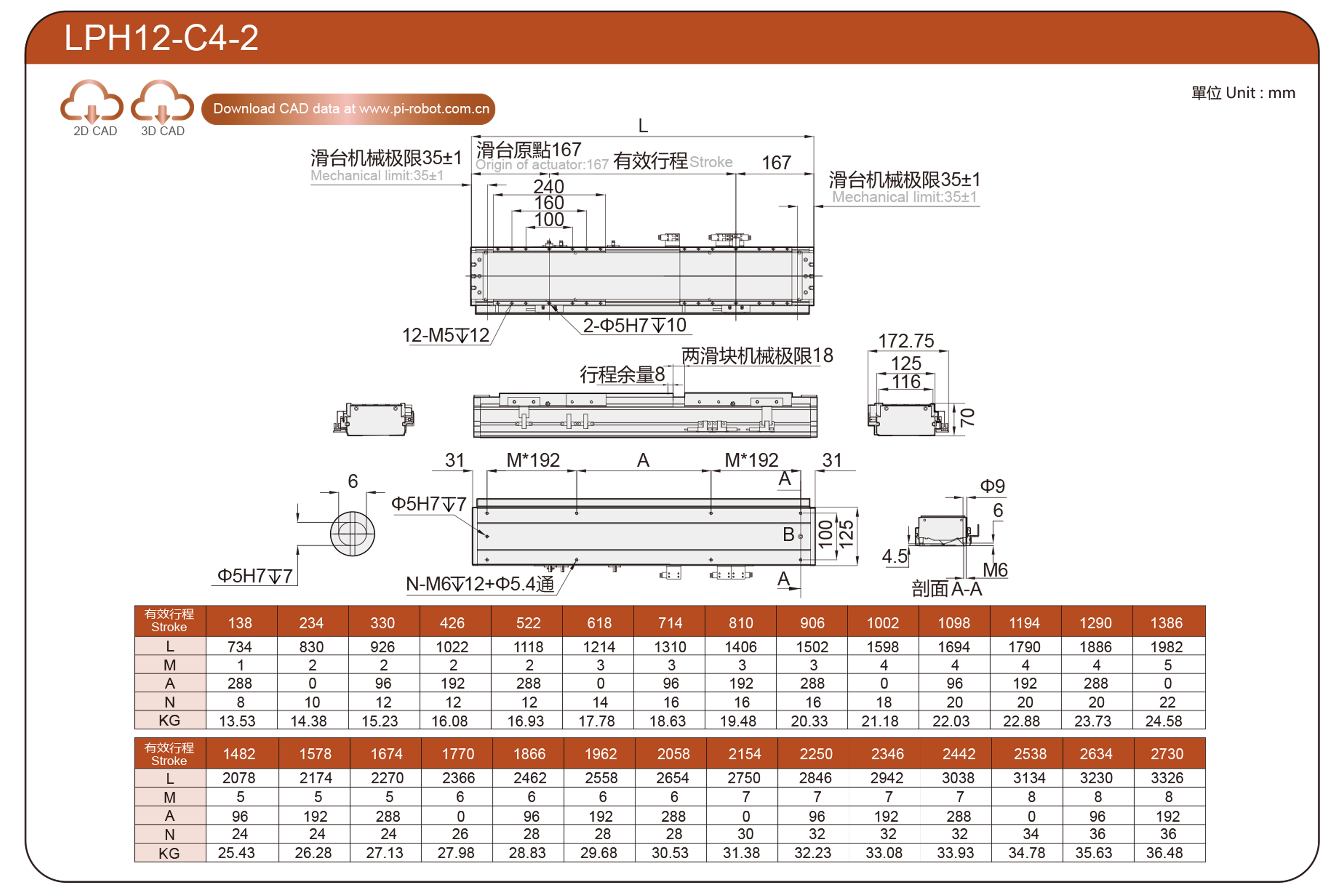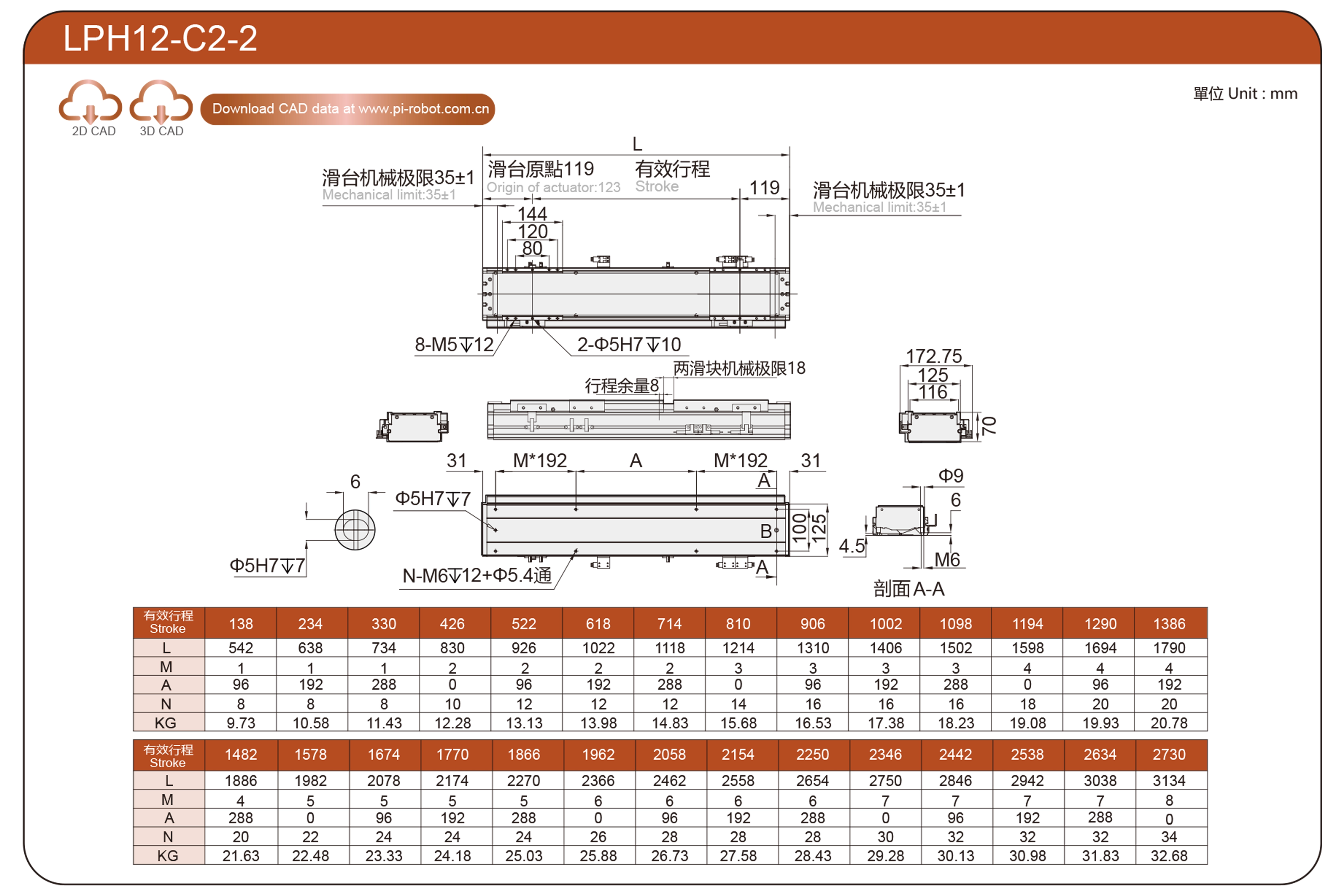 | Standard | Robot con motore lineare | LPH12 | P40-C2-S | 125 | 70 | ±0,003 | 80 | 176 | 3.3 | 20 | 2500 |
