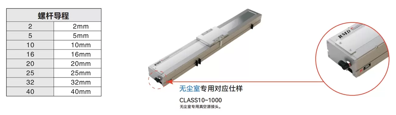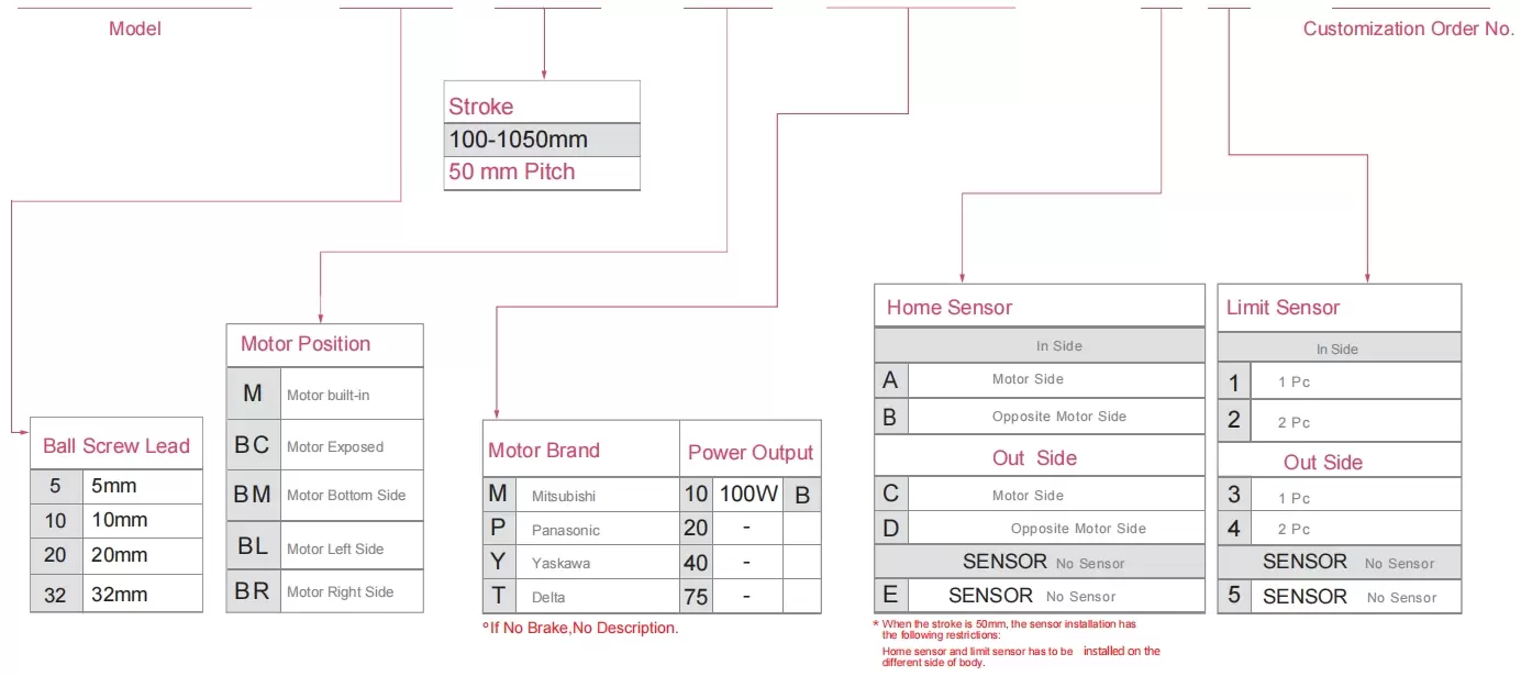 | Usa dove | Modalità guidata | Specifiche del modello | Potenza del motore (la) | Larghezza (mm) | Ripetibilità (mm) | Specifiche della vite a sfere | Carico utile massimo (kg) | Velocità massima (mm/s) *1 | ||