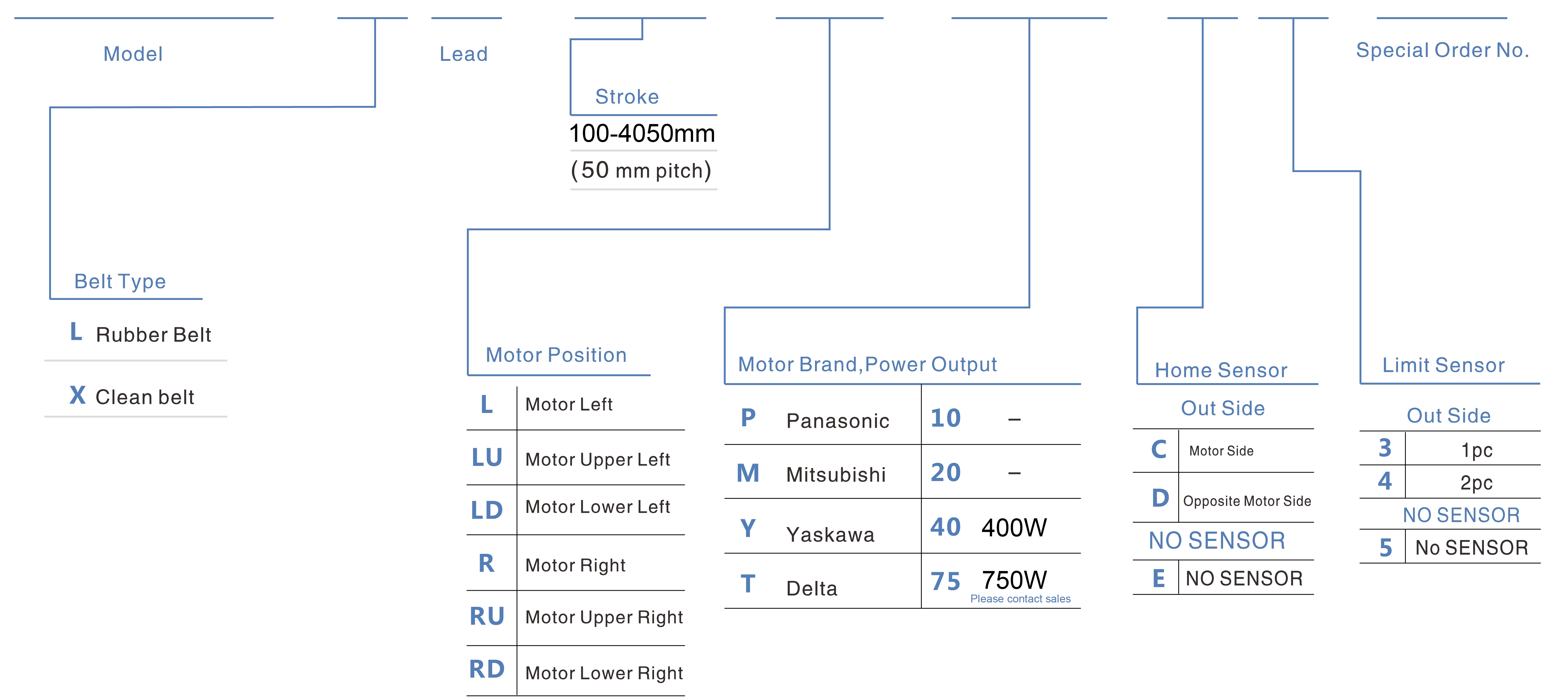 | Usa dove | Modalità guidata | Specifiche del modello | Meccanismo di riduzione | Potenza del motore (la) | Larghezza (mm) | Ripetibilità (mm) | Specifiche della cinghia | Carico utile massimo (kg) | Velocità massima (mm/s) *1 | ||