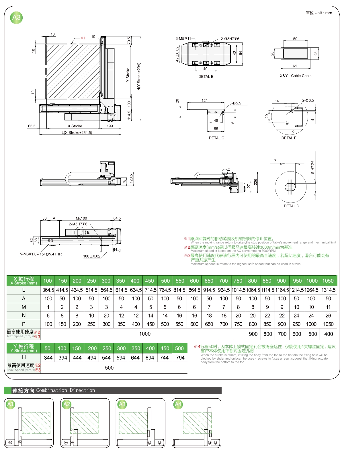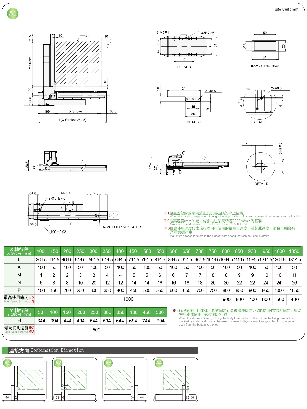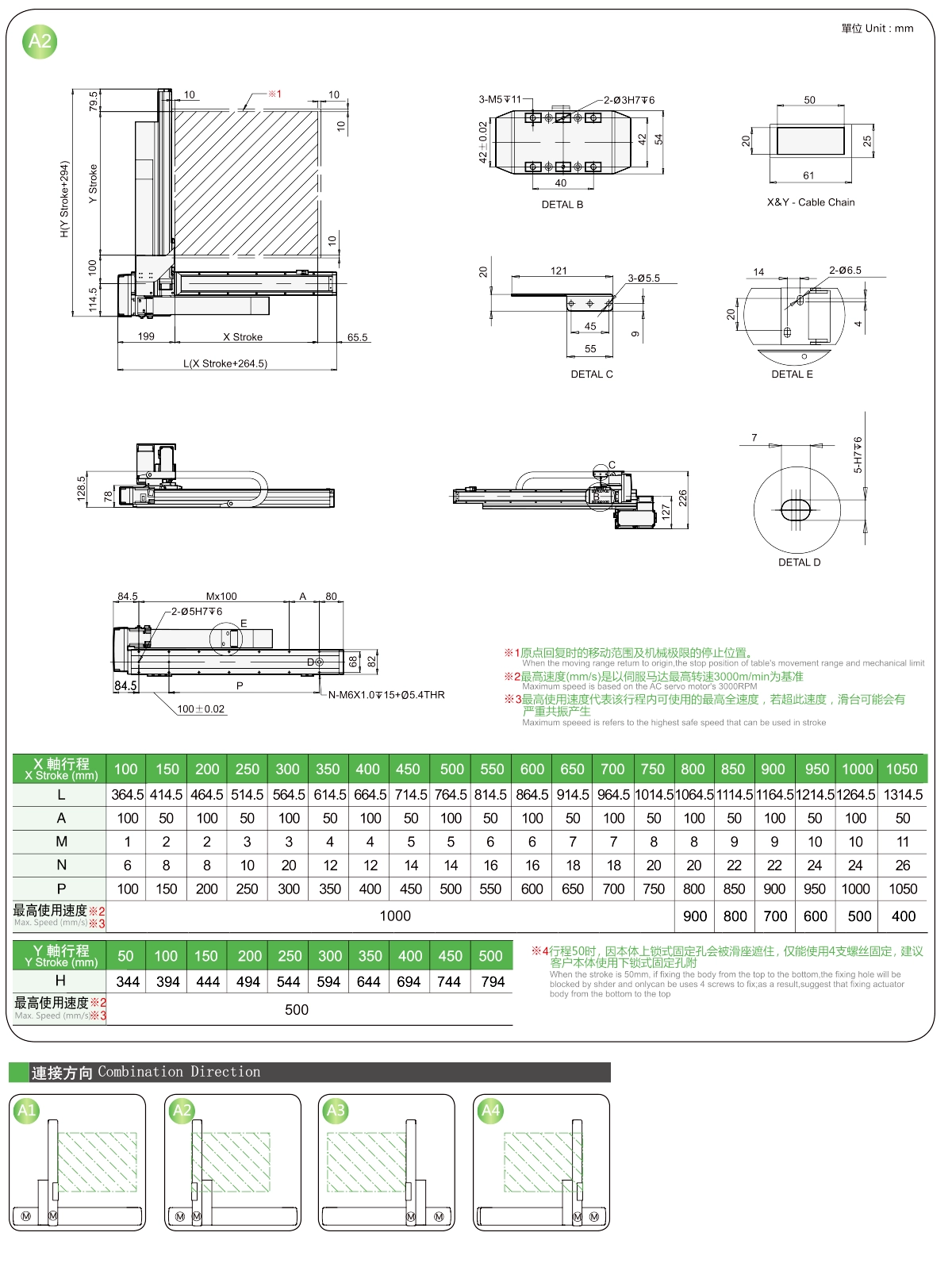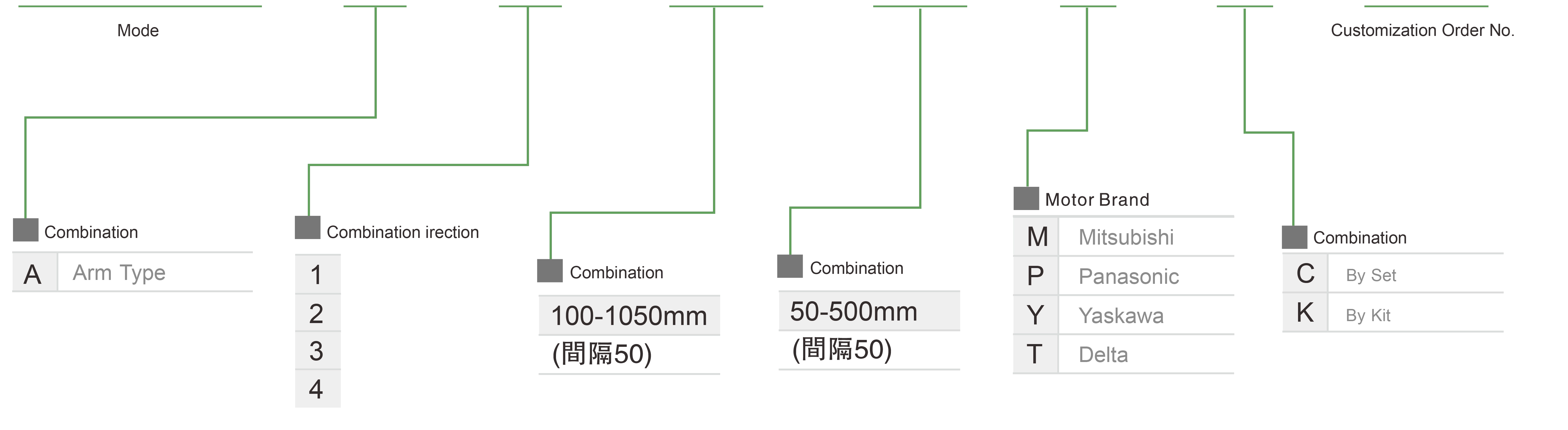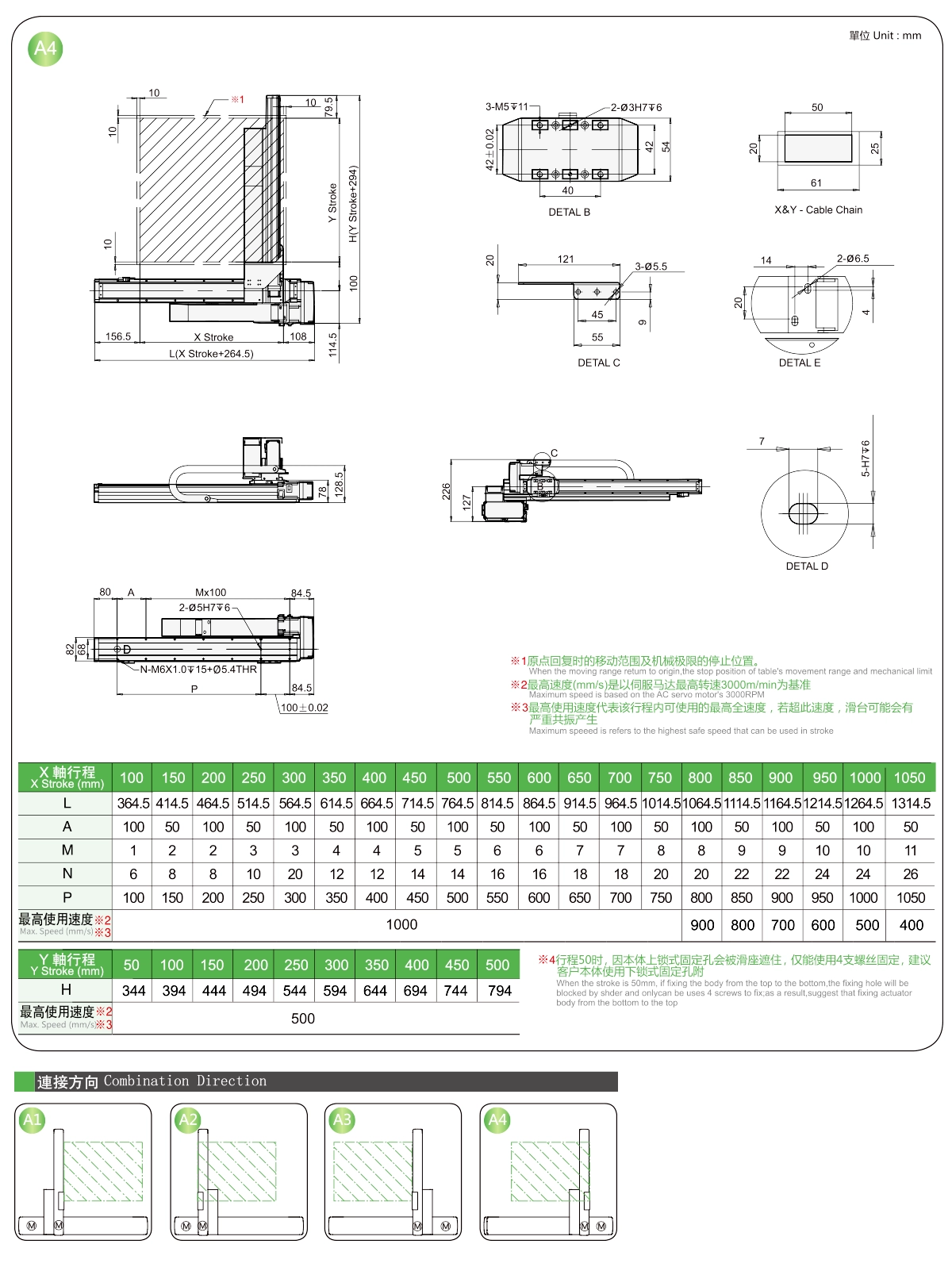 | Usa dove | Modalità guidata | Specifiche del modello | Combinazione | Numeri degli assi | Guida | Velocità massima (mm/s) | Corsa (mm) | ||||||