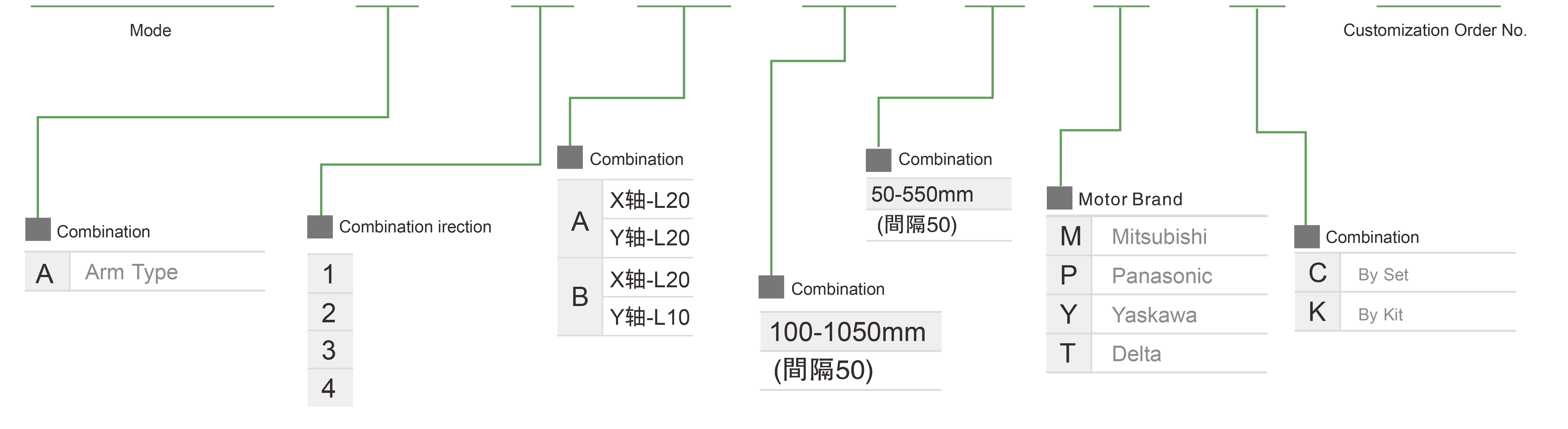 | Usa dove | Modalità guidata | Specifiche del modello | Combinazione | Numeri degli assi | Guida | Velocità massima (mm/s) | Corsa (mm) | ||||||