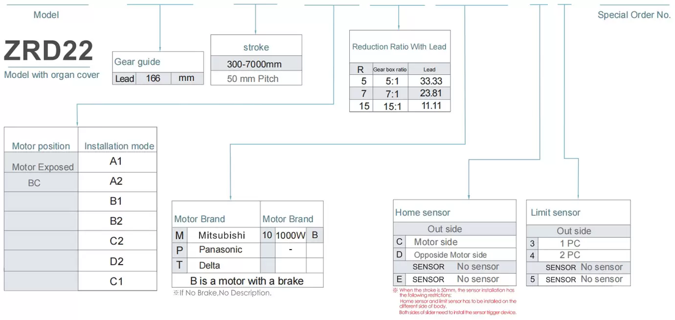 | Usa dove | Modalità guidata | Specifiche del modello | Potenza motore (w) | Larghezza (mm) | Ripetibilità (mm) | Il rapporto dei decrescenti | Dimensioni dell'ingranaggio elicoidale (mm) | Carico utile massimo (kg) | Velocità massima (mm/s) *1 | |||